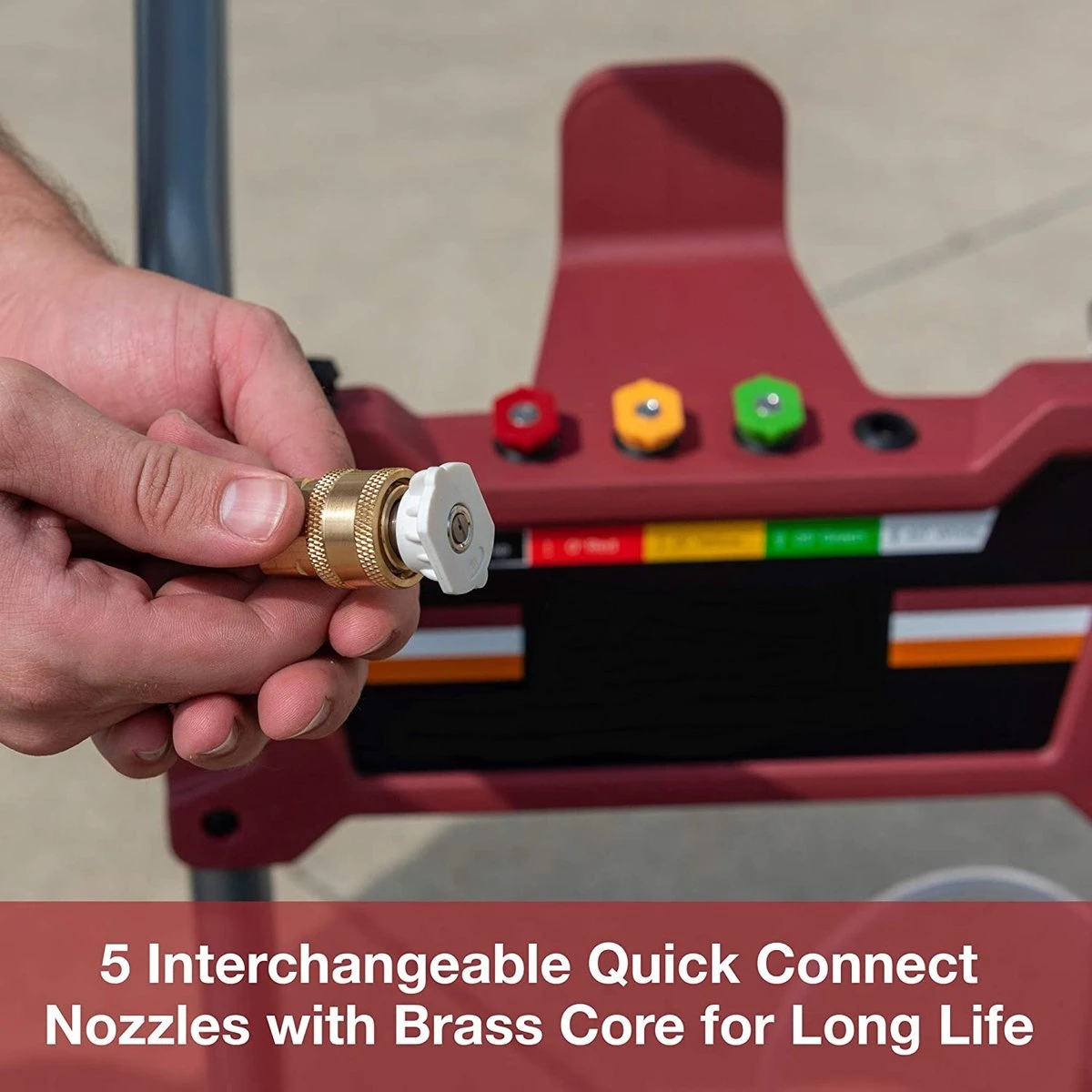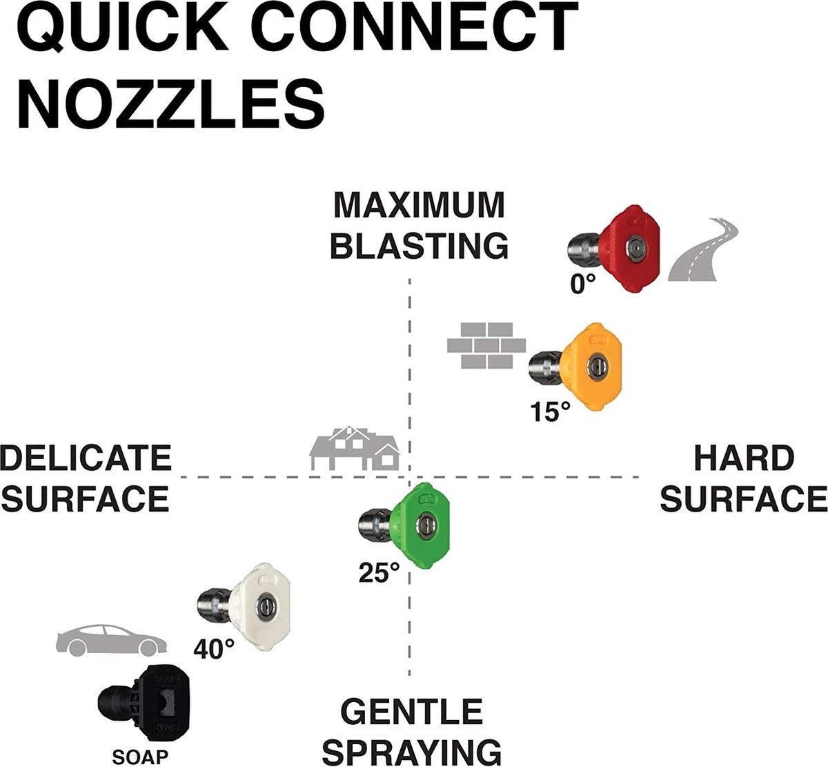 De vijf snel aan te sluiten mondstukken (0˚, 15˚, 25˚, 40˚, zeep) zorgen voor maximale reinigingsprestaties bij elk type project.