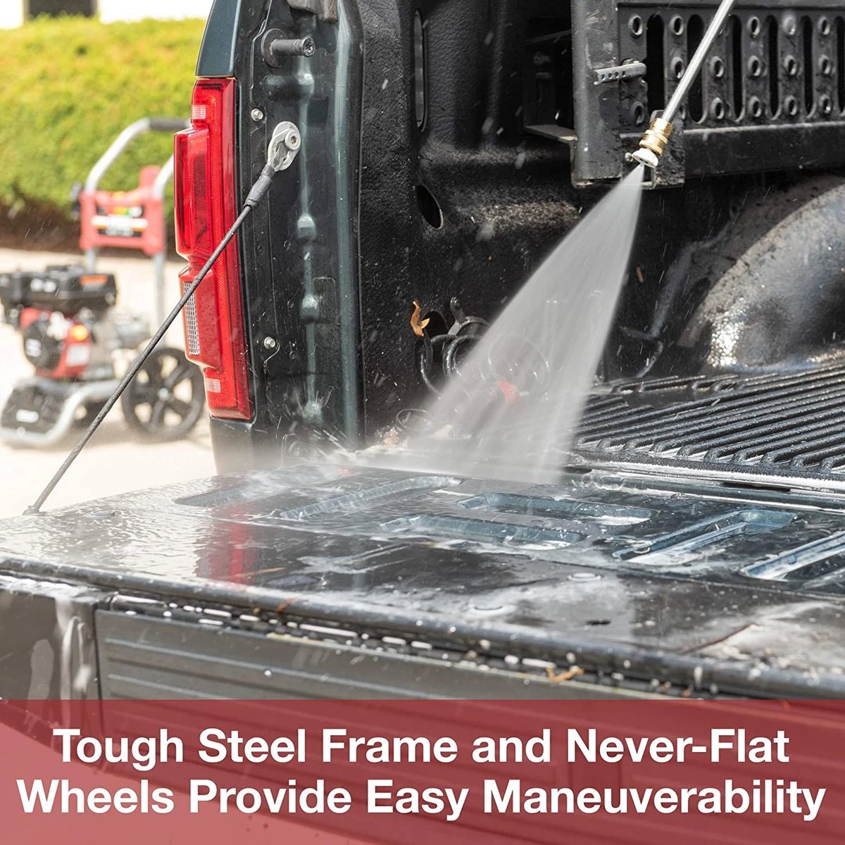 Stalen frame is stevig gelast om duurzaamheid te garanderen en biedt bescherming aan het apparaat. Deze hogedrukreiniger op benzine wordt geleverd met een professionele hogedrukreiniger met een ergonomische handgreep, corrosievrij en roestvrij stalen hogedrukreiniger met 5 snel aan te sluiten spuitmondpunten variërend van 0°, 15°, 25°, 40° en zeep voor diverse en veelzijdige reinigingstaken. De hogedruk antiknik en corrosiebestendige flexibele zachte slang zijn ingebouwd om bestand te zijn tegen hoge druk en stijf gebruik. Deze heeft ook premium pneumatische wielen voor eenvoudige mobiliteit en gemak tijdens het wassen.